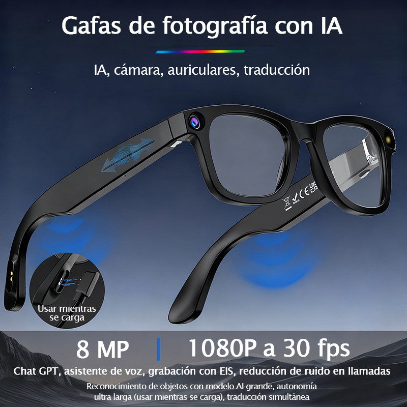 Gafas Inteligentes con IA M20S: Cámara 8MP, Asistente de Voz, Traducción IA, Música Bluetooth, Llamadas y Cancelación Inteligente de Ruido